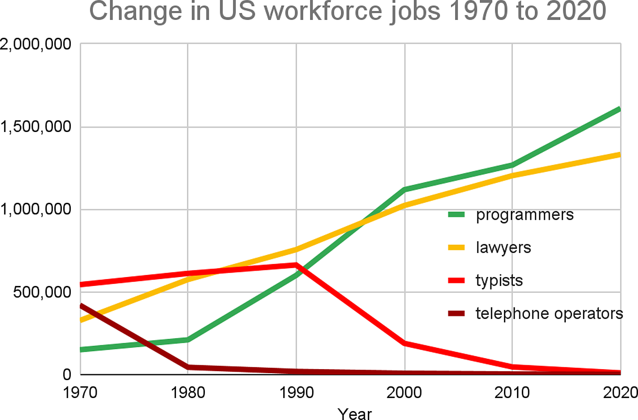 Technological advancements have long led to the decline of some jobs and the creation of new ones. For the U.S. workforce, 63% had jobs in 2018 that did not exist in 1940 [Autor 2022]. Figure 1 shows examples of four jobs where numbers changed strikingly from 1970 to 2020.